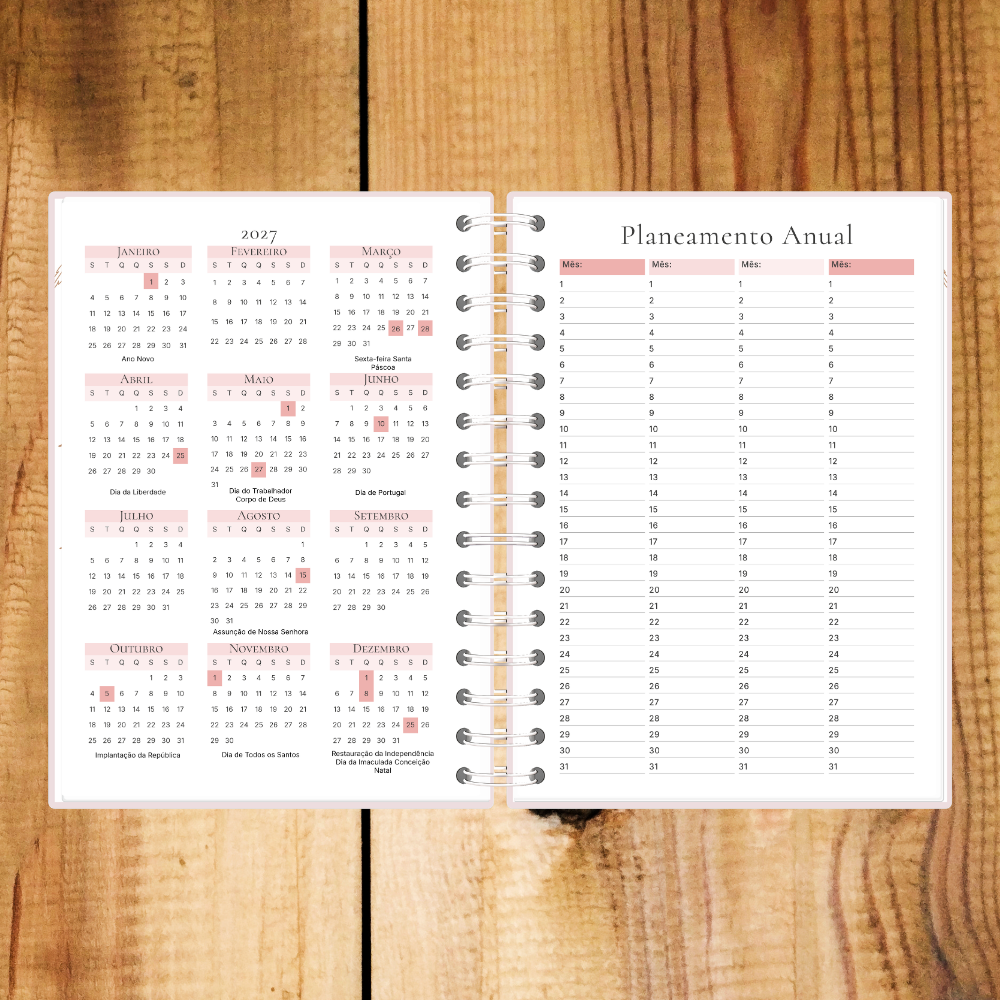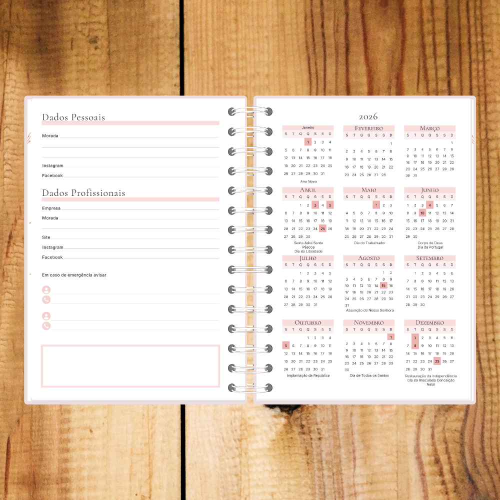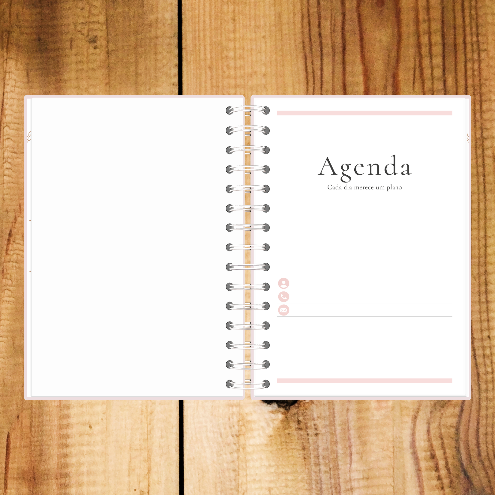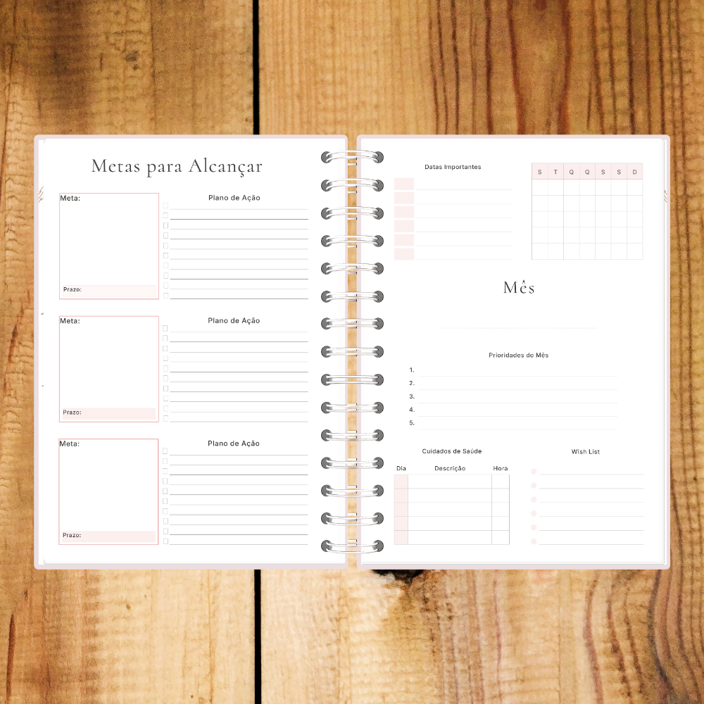 Com páginas de planeamento anual, metas, prioridades mensais, finanças do mês e organização diária com blocos horários e espaço para prioridades, adapta-se ao teu ritmo e ajuda-te a acompanhar a tua vida de forma prática e completa. O interior inclui ainda páginas para datas importantes, wish list, cuidados de saúde e notas, tornando esta agenda numa ferramenta versátil para o dia a dia.