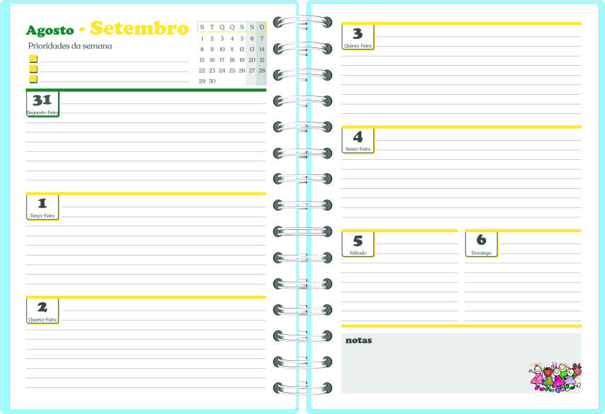 – Opção Vista semanal – Em 2 páginas, com registo de prioridades da semana, notas e mini calendário