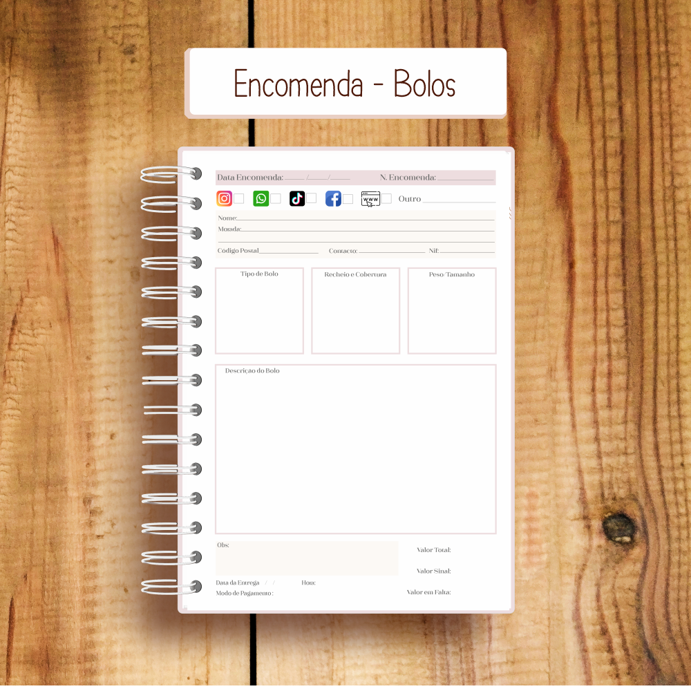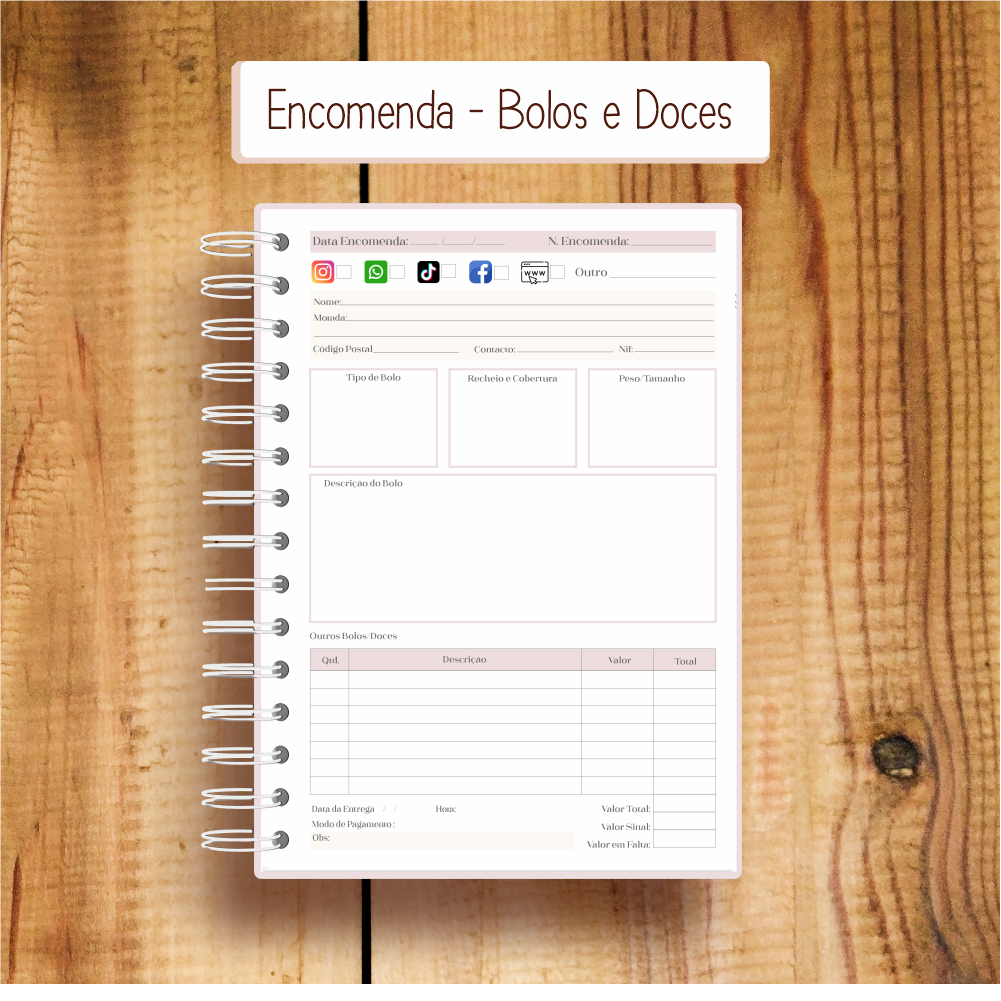 Assim, podes escolher o interior que melhor corresponde à tua atividade — seja um registo detalhado por encomenda, maior volume por página ou layouts específicos para bolos ou para bolos e doces.